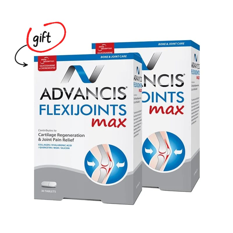 Advancis® FlexiJoints Max is a premium food supplement formulated with fast-absorbing Glucosamine and Chondroitin, MSM (Methylsulfonylmethane), and Hyaluronic Acid—key components naturally found in the body that help support cartilage health and joint balance. The formula also includes Silicon and Quercetin for enhanced joint support and overall wellness.
