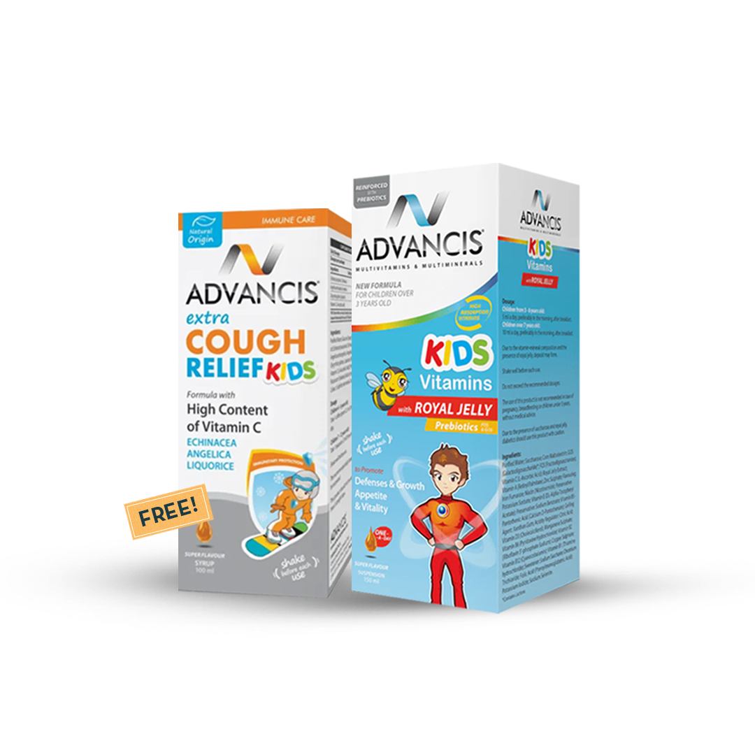 Advancis Extra Cough Relief Kids is a food supplement, presented as a syrup, that represents a complete and specialized formula comprising Echinacea, Angelica, Liquorice and is reinforced with high content of Vitamin C. Advancis® Cough Relief Kids presents a pleasant flavour and was specially developed for children from 3 years old.