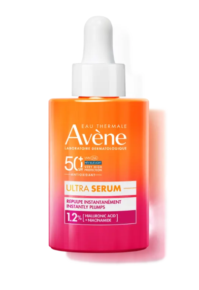 Protect & plump with Avène Ultra Serum SPF 50+. A lightweight serum with Hyaluronic Acid & Niacinamide for sensitive skin. No white cast, invisible finish.