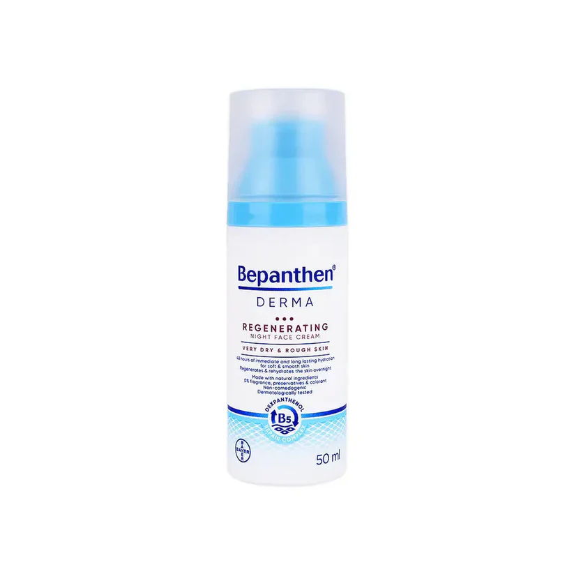 Bepanthen Derma Regenerating Night Face Cream deeply moisturizes and nourishes very dry skin overnight, leaving it soft, smooth, and comfortable by morning. Made with natural ingredients and free from fragrance, preservatives, and colorants, its dermatologically tested formula absorbs quickly, providing immediate hydration to soothe tightness and restore the skin’s natural radiance. Enriched with a special Repair Complex and high levels of natural lipids, it addresses the underlying causes of dryness, supports overnight skin regeneration, and helps prevent recurrence of dryness, offering long-term moisturization for up to four weeks. Part of the Bepanthen Derma range, it delivers both instant relief and lasting care for healthier, more resilient skin.