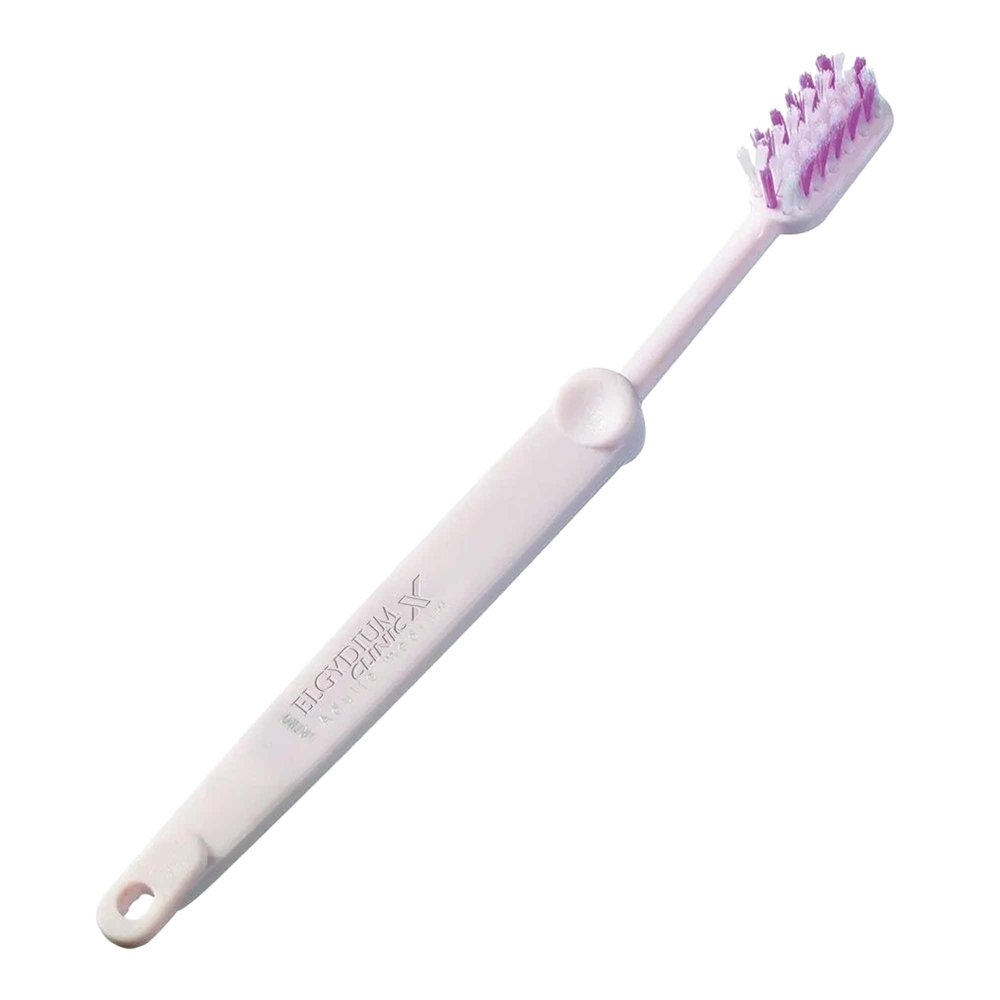 The ELGYDIUM CLINIC ORTHODONTICS toothbrush has bristles criss-crossed around the edge that pass under the arch wire of the brackets and clean hard-to-reach areas.