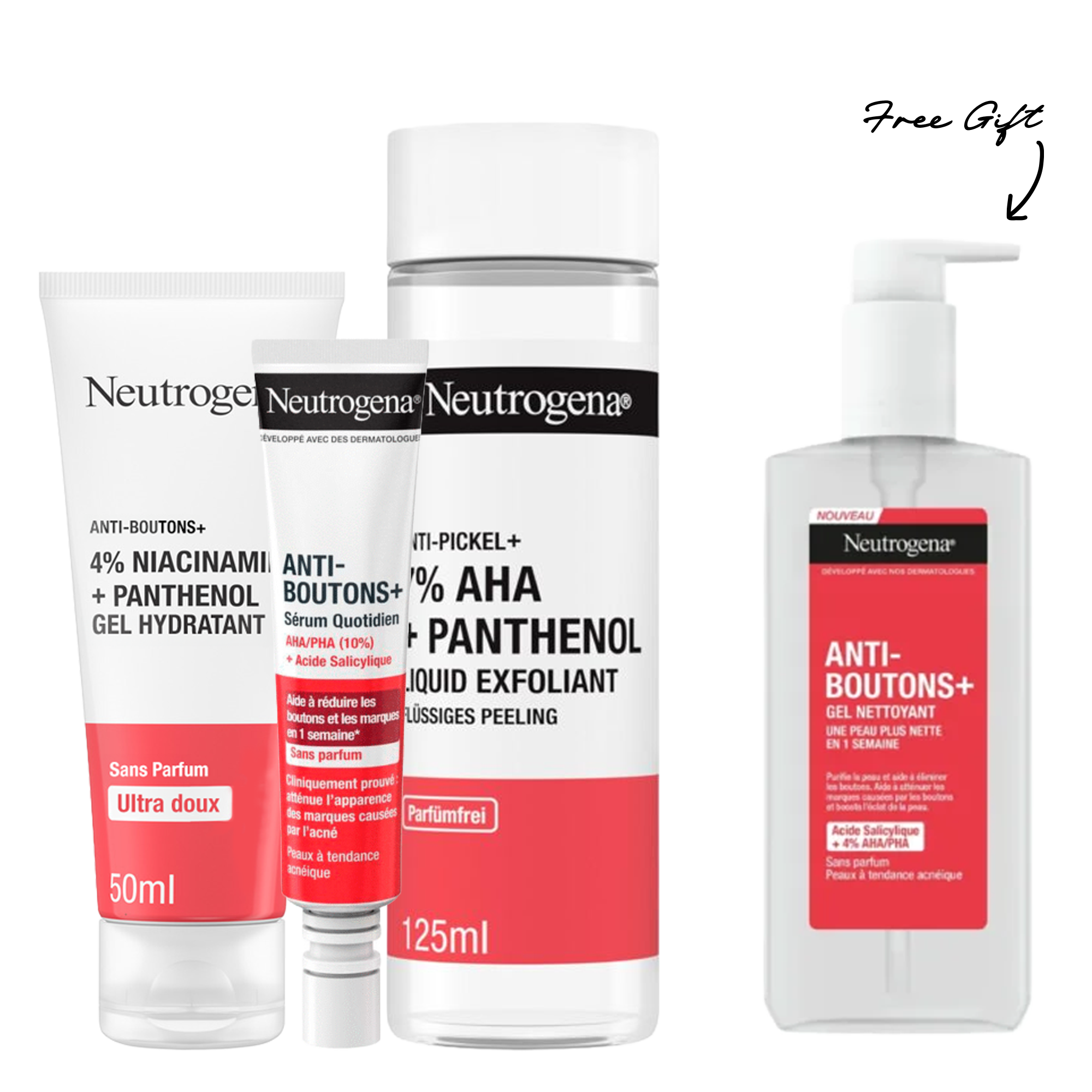 Hydrating gel 50 ml + serum Anti-boutons 30ml + liquid exfoliantion toner 125 ml + Free foaming gel 200ml.