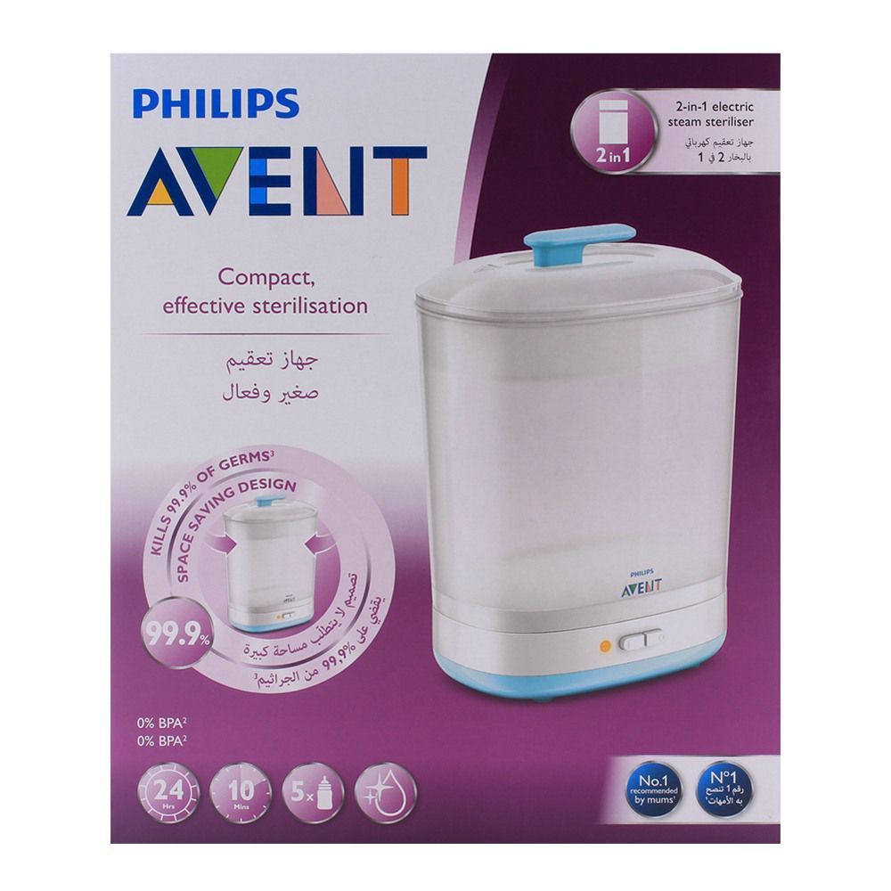 2-in-1 space saving design, Sterilizes in 10 minutes, Fits 5 Philips Avent bottles, Kills 99.9% of harmful germs. Sterilize the bottles and accessories like teats, caps and soothers in the small basket of the sterilizer. The sterilizer is designed in such a way that it doesn’t even take too much space. Natural steam is used to sterilize baby bottles and other products which kills 99.9% of harmful germs without any chemical. This gives every mom a peace of mind that their babies are using sterilized bottles. Sterilizer keep the contents like bottles and accessories sterilized for up to 24 hours if the lid is kept closed. The sterilizing is done in about 10 minutes and after that the sterilizer shuts off automatically. The compact and spacious design of the sterilizer fits 5 Philips Avent baby bottles at one time. With the help of our open design, it is really easy to keep the heating plate clean, allowing you to sterilize with clean steam every time. Sterilizer’s lid is designed in a way that it can be hung on the side of the sterilizer after using it. Sterilizer is used for both standard and wide neck baby bottles. It also sterilizes other baby and mother care products like breast pumps and accessories.